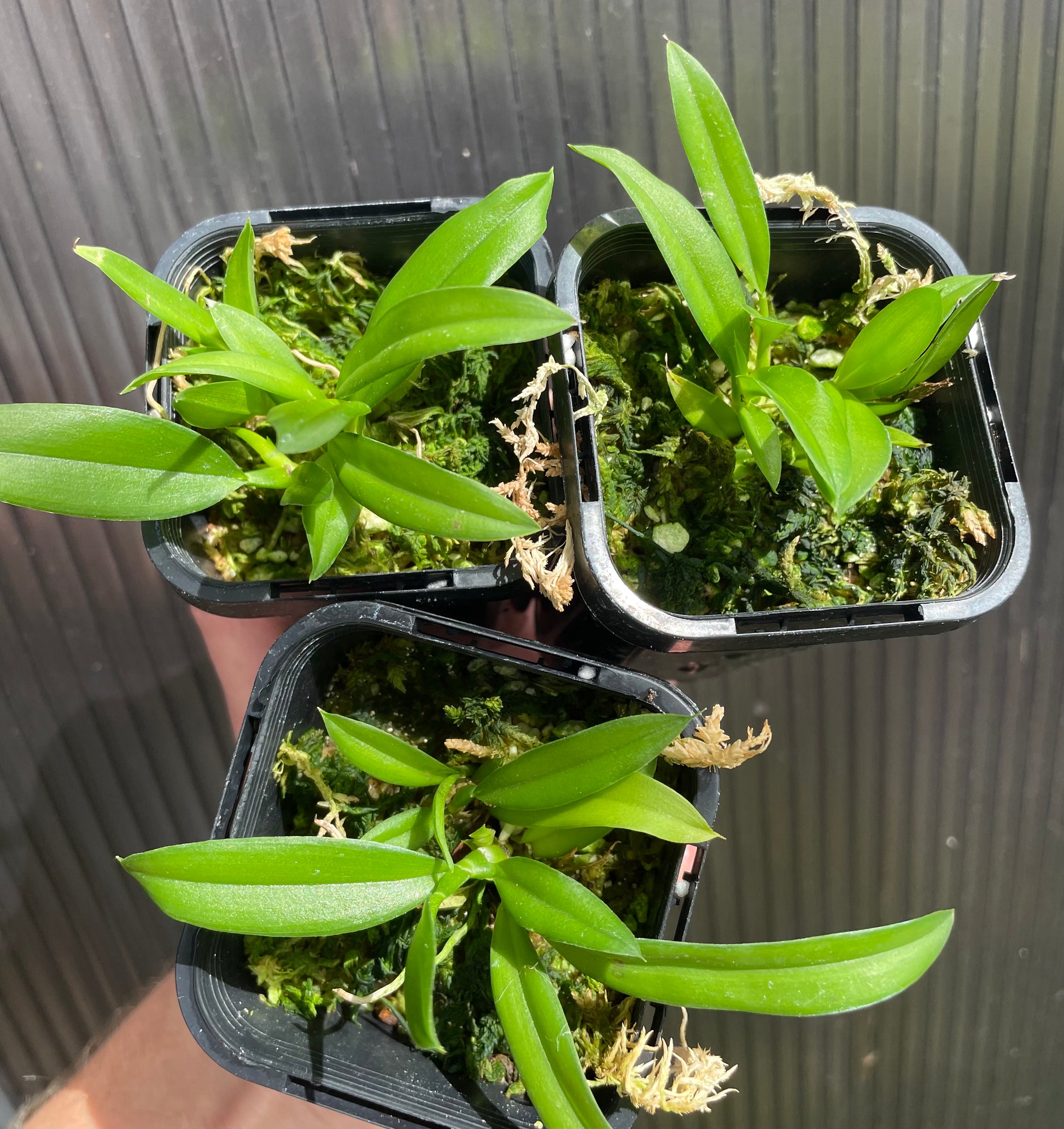This orchid thrives in bright, indirect light, with an east-facing window or these days LED grow lights being suitable options. Consistent moisture is important for the fine root system; the potting medium should be kept moist but not waterlogged, and allowed to dry slightly between waterings. Intermediate to warm temperatures and moderate humidity (50–70%) with good air circulation are ideal. Use a fine-grade, well-draining orchid mix and repot every 1-2 years. Fertilise regularly with a balanced, water-soluble fertiliser, particularly during active growth.